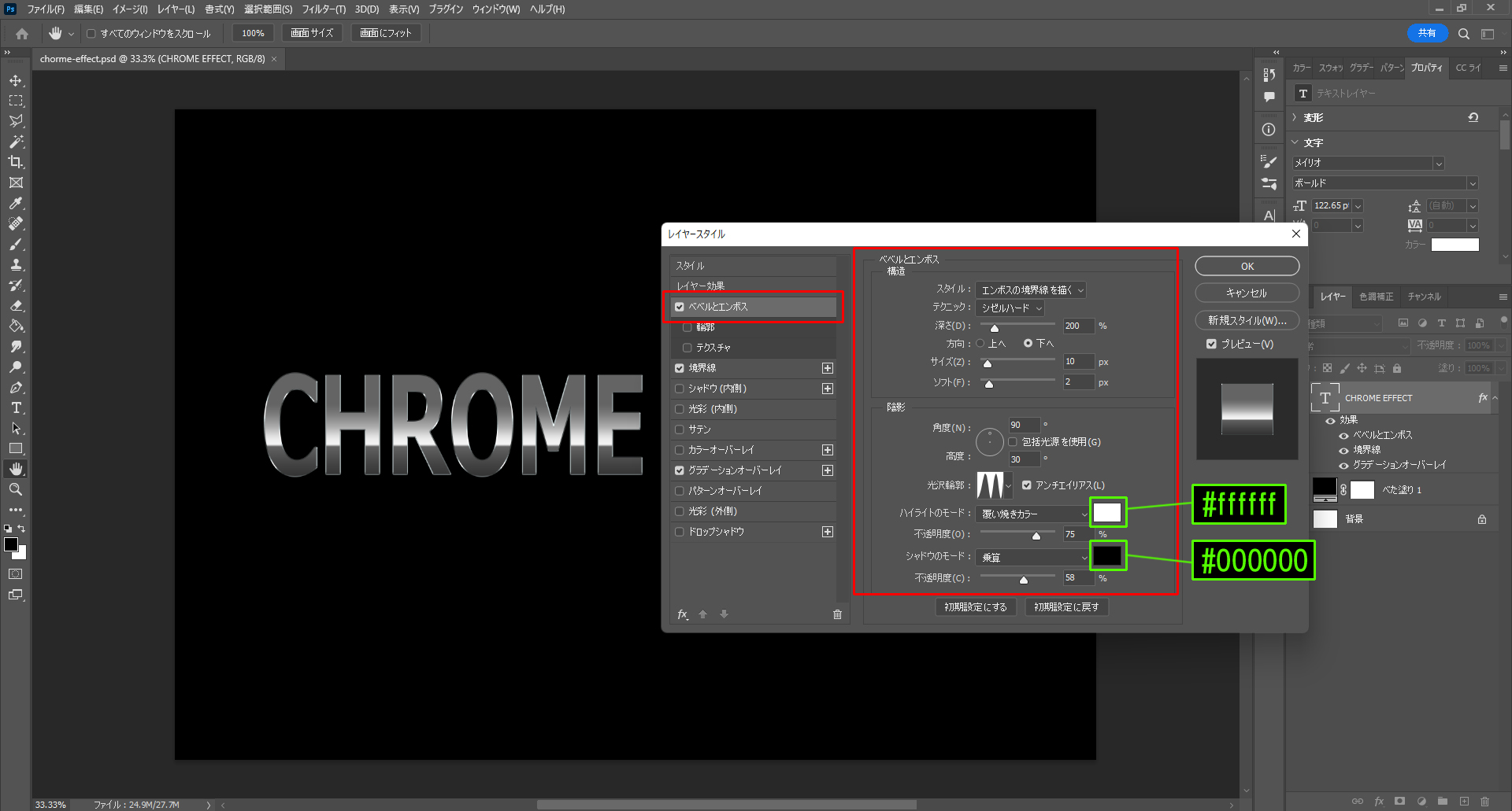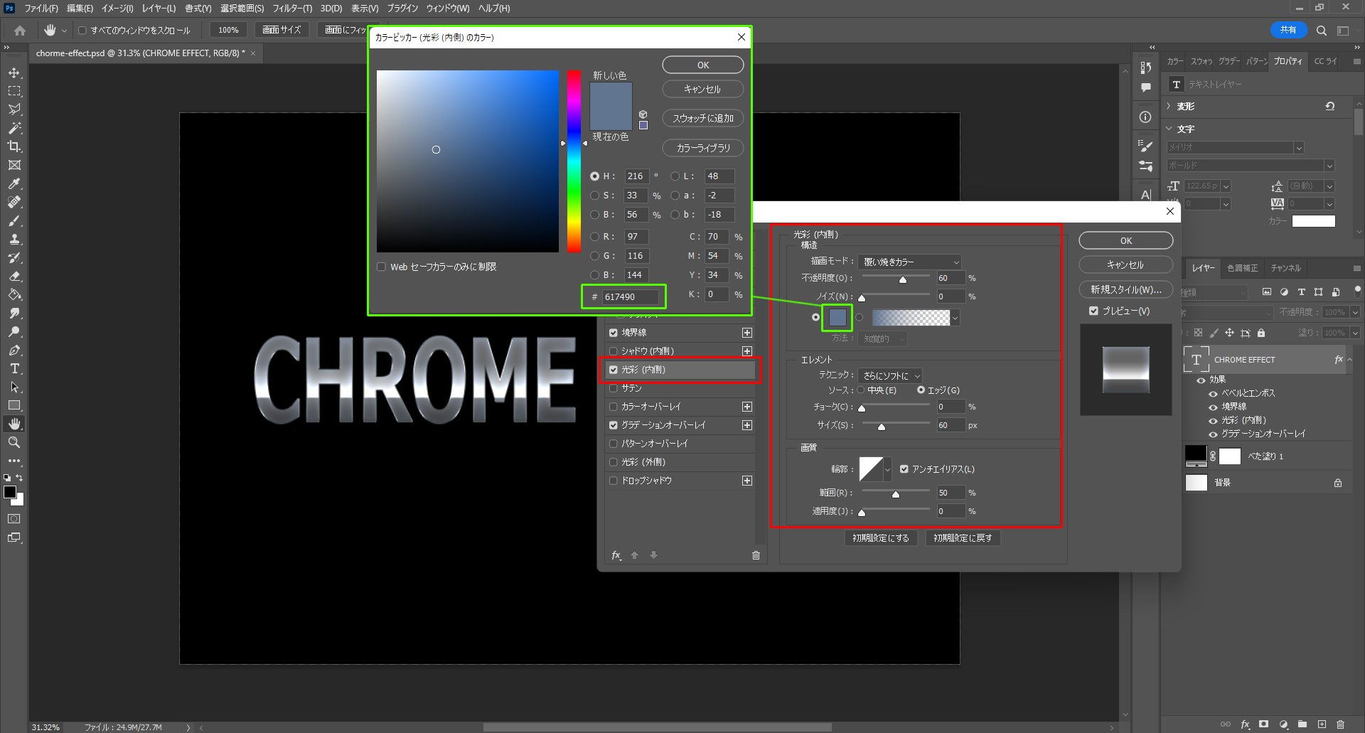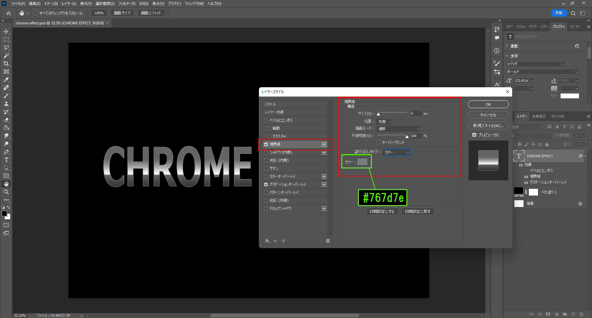- CHROME EFFECTレイヤーをダブルクリック または 右クリック → レイヤー効果、レイヤースタイルを表示
