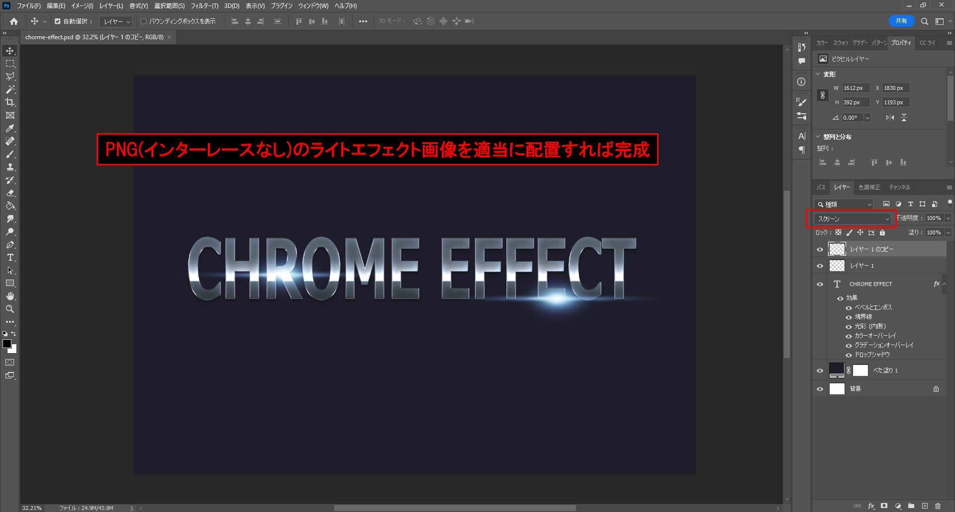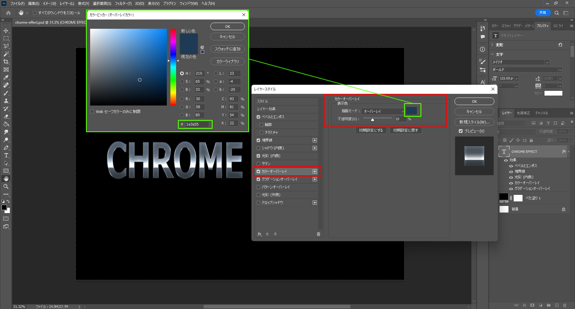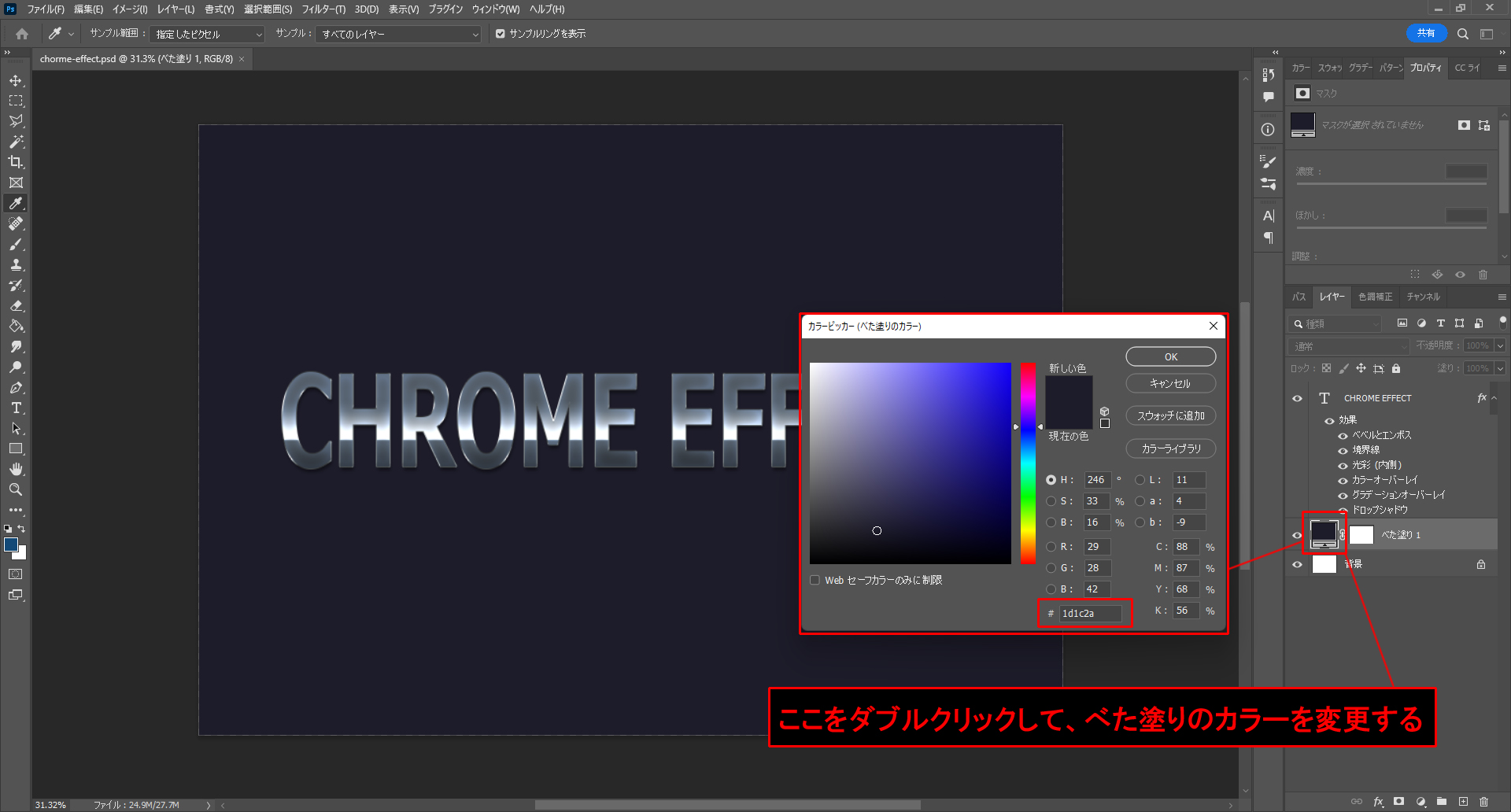 - CHROME EFFECTレイヤーをダブルクリック または 右クリック → レイヤー効果、レイヤースタイルを表示