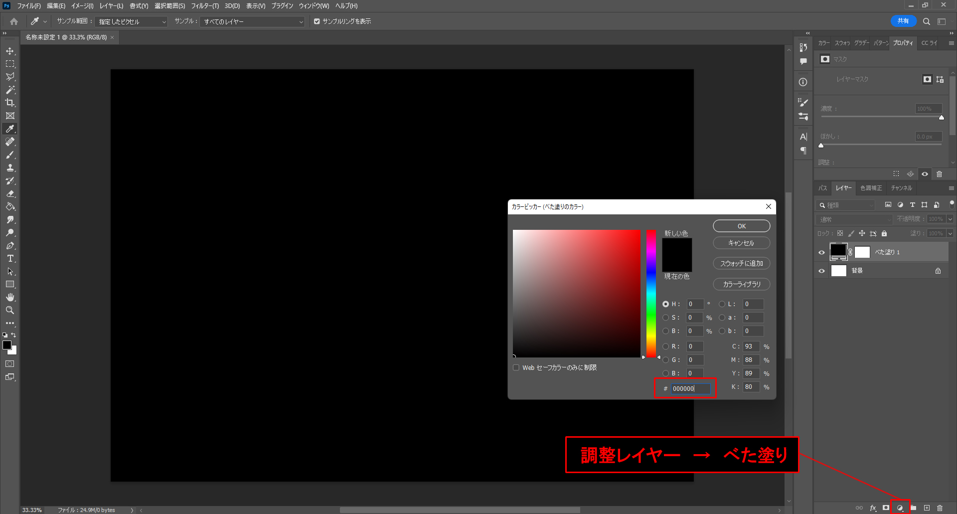 - 右下の調整レイヤー → べた塗り…(カラーピッカー:#000000)