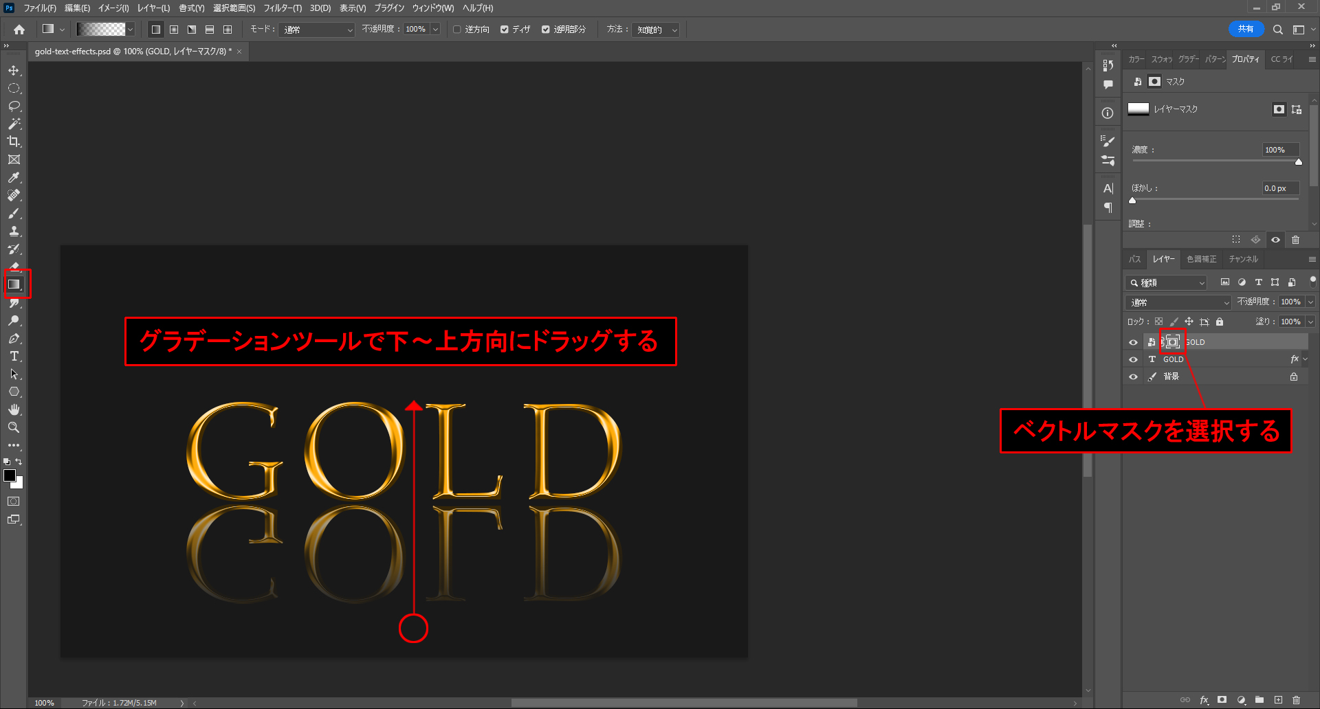 - ベクトルマスクを選択し、グラデーションツールで下から上方向にドラッグしてください