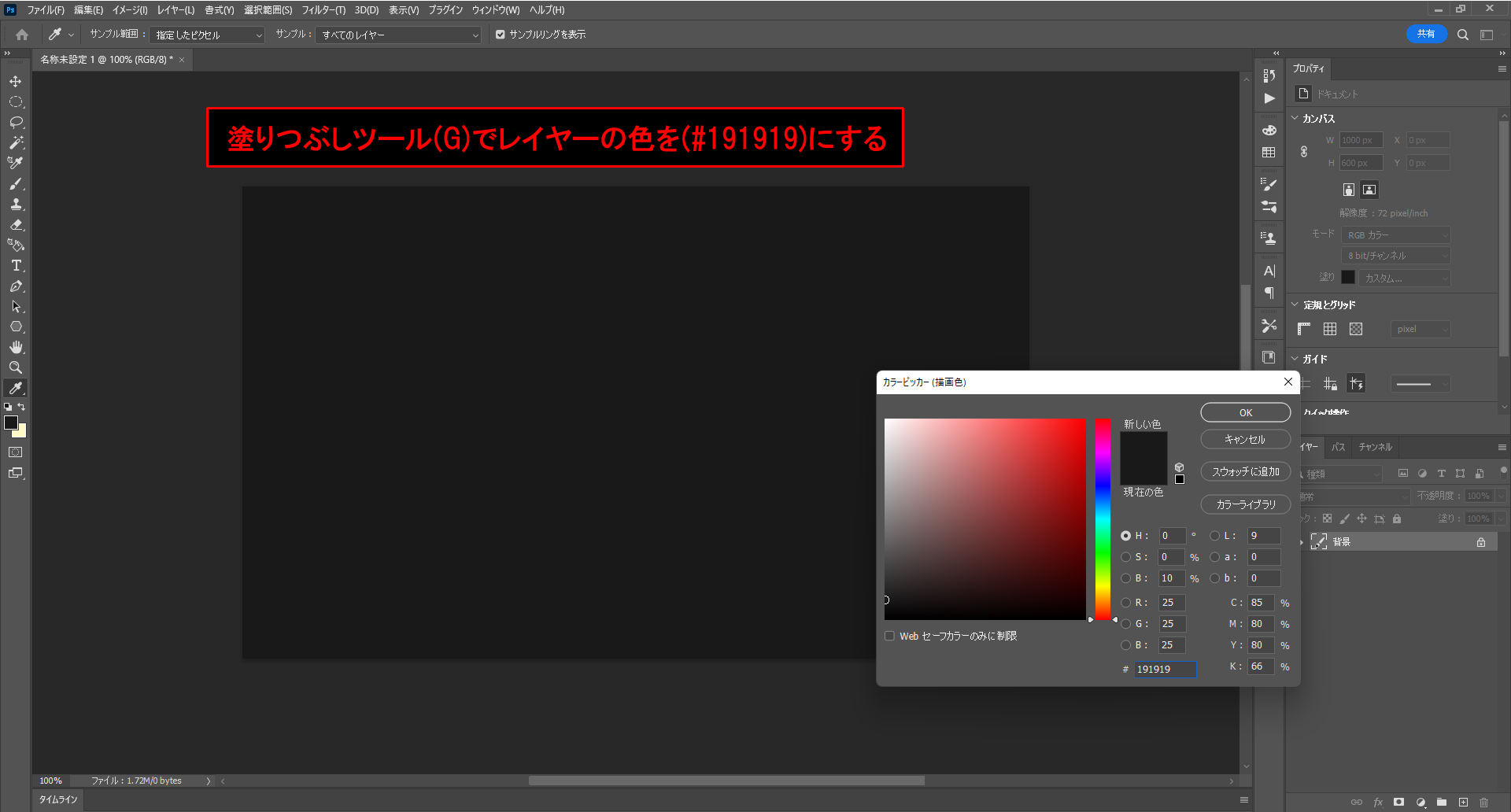 - 塗りつぶしツールで全体を(#191919)の色にします