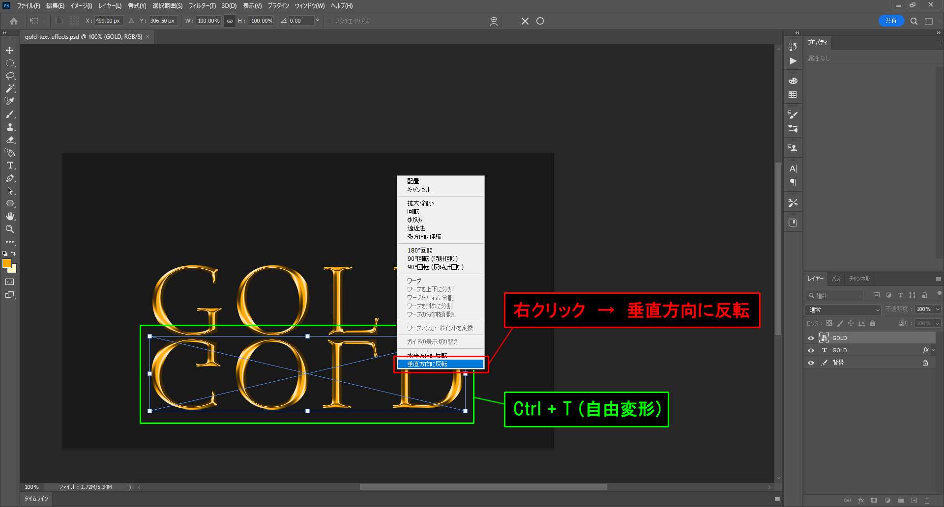 - 複製したGOLDテキストレイヤーを Ctrl + T 自由変形にします