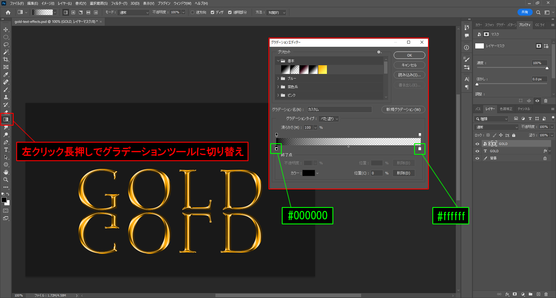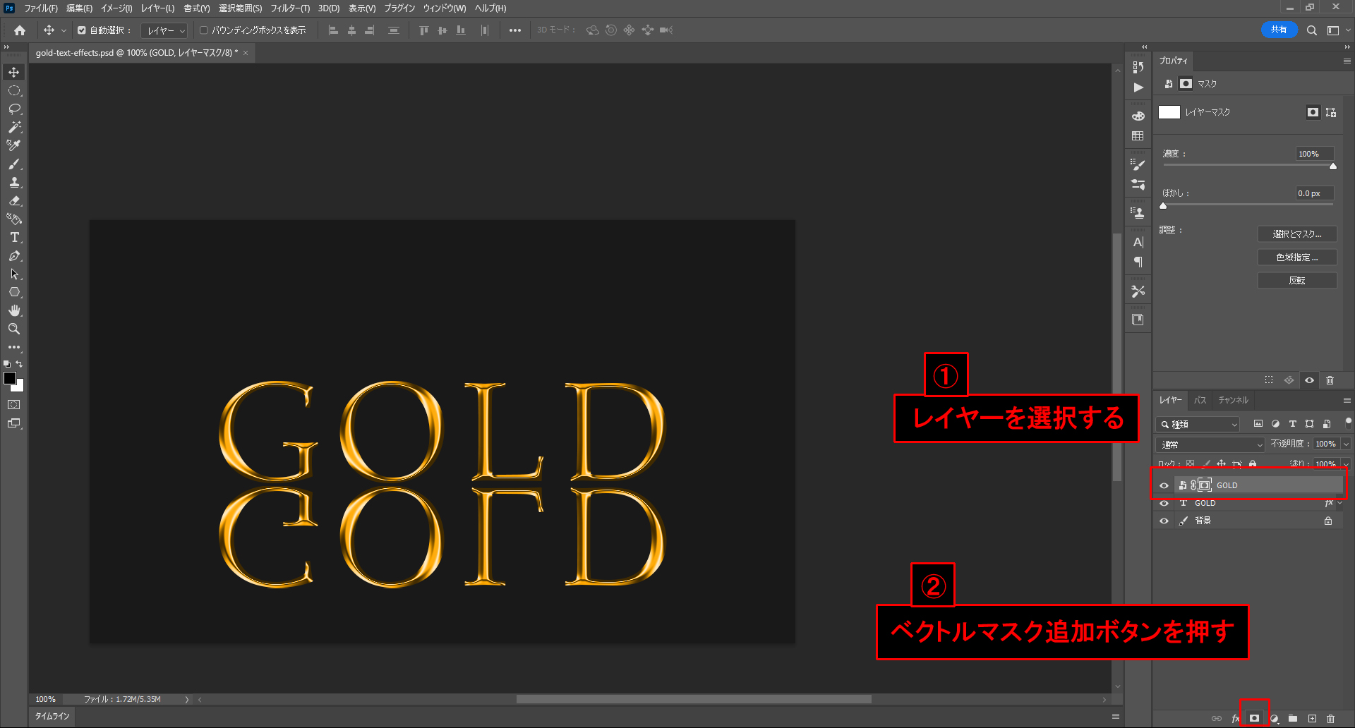 - 反転させたGOLDテキストレイヤーにベクトルマスクを追加します